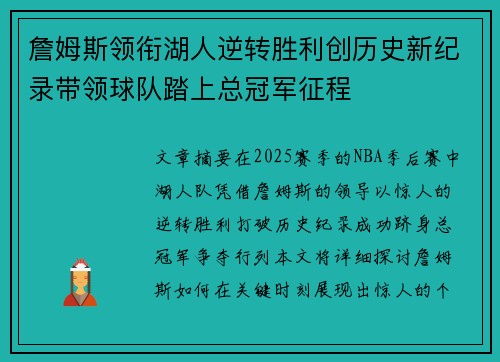 okooo澳客网官网在2025赛季的NBA季后赛中,湖人队凭借詹姆斯的领导,以惊人的逆转胜利打破历史纪录,成功跻身总冠军争夺行列。本文将详细探讨詹姆斯如何在关键时刻展现出惊人的个人能力,带领湖人队逆转胜利,打破历史纪录,并最终为球队注入了更多的信心与动力。文章从四个方面展开分析:詹姆斯的个人表现与关键时刻的领导力;湖人队整体战术的调整与执行;詹姆斯如何与队友们密切合作实现逆转;以及逆转胜利背后湖人队文化与团队精神的体现。通过这些方面的细致分析,我们将全面解读这场标志性的胜利,及其对湖人未来总冠军之路的意义。