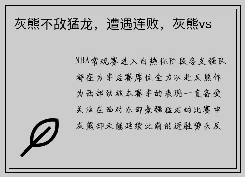 NBA常规赛进入白热化阶段,各支强队都在为季后赛席位全力以赴。灰熊作为西部劲旅,本赛季的表现一直备受关注。在面对东部豪强猛龙的比赛中,灰熊却未能延续此前的连胜势头,反而遭遇连败,令人大感意外。这场比赛不仅让灰熊的连胜纪录告一段落,也让人们开始重新审视这支球队的潜力与挑战。