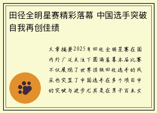 随着田径全明星赛的圆满落幕,选手们的表现和突破不仅让人印象深刻,也为中国田径的发展带来了新的思考和启示。这场比赛充分展示了中国选手的实力和潜力,也为中国田径在世界舞台上的崛起奠定了基础。特别是中国选手在多个项目上的突破,不仅增强了国家队的信心,也让外界看到了中国田径未来可期的一面。